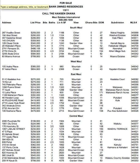 Don't Miss Out. Call The Hansen Ohana for more information! Posted on January 14, 2011 by The Hansen Ohana Click on the link below for a list of Bank Owned Homes on Maui or call 808-879-3667. Share this:Share Email a link to a friend (Opens in new window) Email Share on Facebook (Opens in new window) Facebook Share on Pinterest (Opens in new window) Pinterest Share on X (Opens in new window) X Share on Tumblr (Opens in new window) Tumblr Like Loading... Related