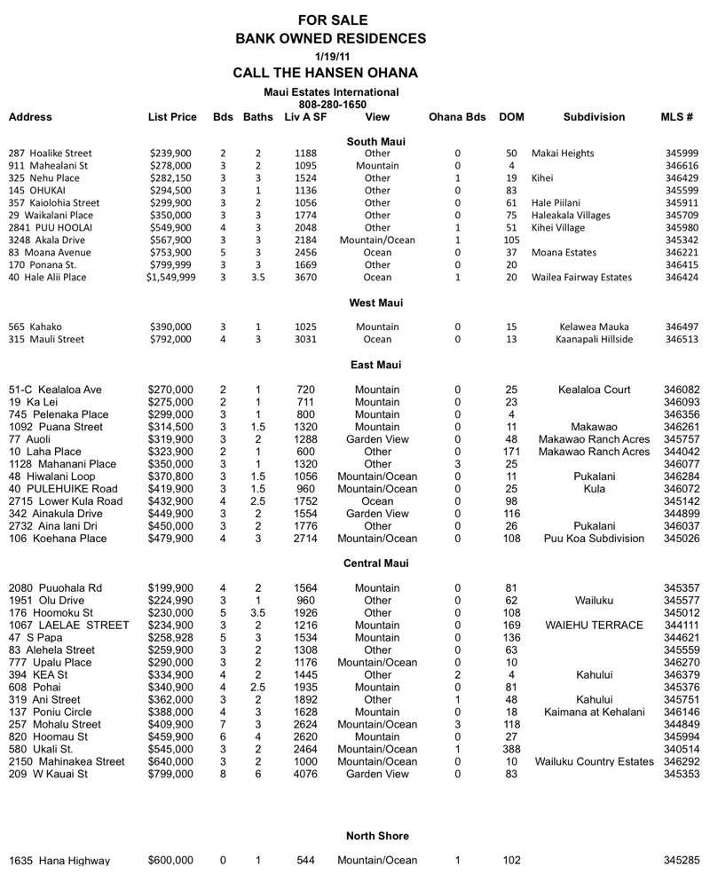 Interested In Bank Owned Properties? Posted on January 19, 2011 by The Hansen Ohana Please contact Donna D. Hansen, Realtor (S) at 808.280.1650 or Bob Hansen, Broker, at 808. 283.9456 Share this:Share Click to email a link to a friend (Opens in new window) Email Click to share on Facebook (Opens in new window) Facebook Click to share on Pinterest (Opens in new window) Pinterest Click to share on X (Opens in new window) X Click to share on Tumblr (Opens in new window) Tumblr Like Loading... Related